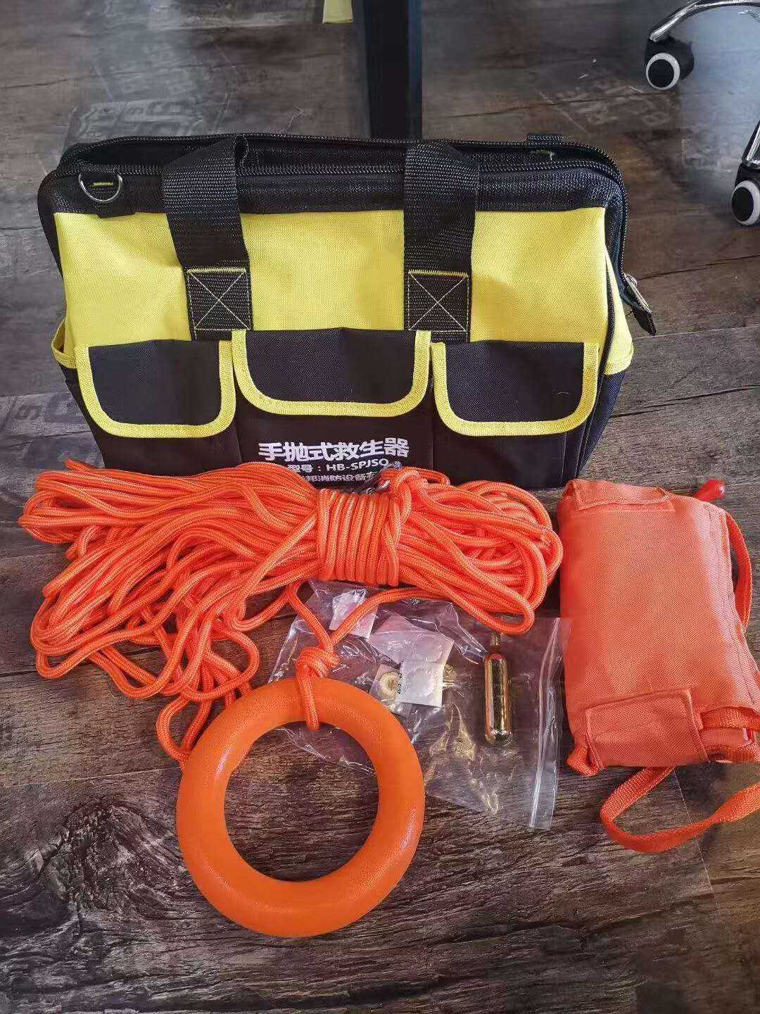 可遠距離投擲,可自動充氣。每套配置4 枚手拋彈頭,彈頭內置自動救生圈,每發彈頭落水2.9秒內自動打開形成具有浮力155N的救生圈。配置直徑8 毫米,長度30米水域救生繩一根。救生圈更換配件可實現多次重復使用。 配置:手拋彈頭。水域救援繩。水域救援手環。安全鉤。