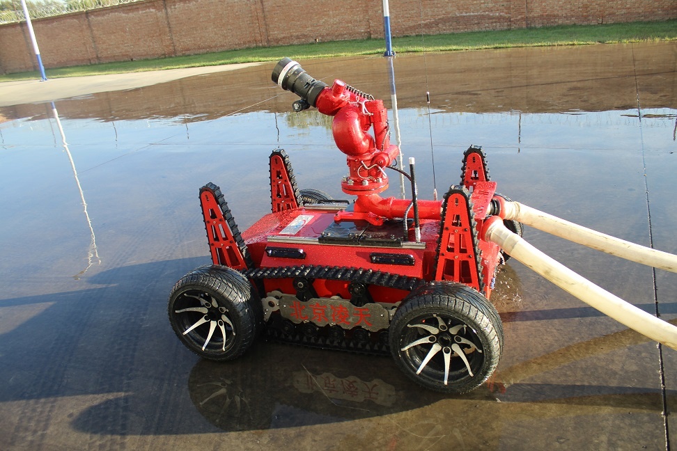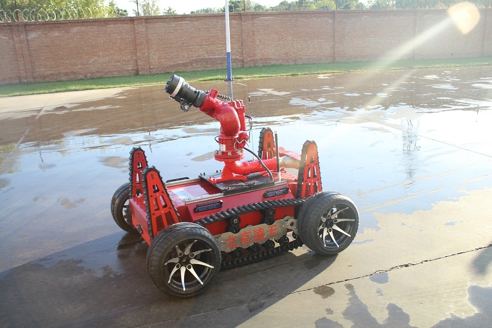 RXR-M80LGD消防滅火機器人采用鋰電池電源作為動力電源,救援人員可遠距離操控。本產品可適用于各種大型危險化學品、高層樓宇建筑、大跨度商業建筑、工廠、商貿企業、礦山、隧道、地鐵等事故救援,主要替代消防員在執行危險救援任務。本產品具備滅火、音視頻偵察、有毒有害氣體偵察、災區環境偵察功能;機器人采用前后4擺臂+履帶+4輪胎輪履底盤結構,輪履合一的設計可以將速度和越障能力都能得到保證;輪式結構可以大幅度提高機器人的行駛速度,保證了機器人的快速部署、快速投入救援;