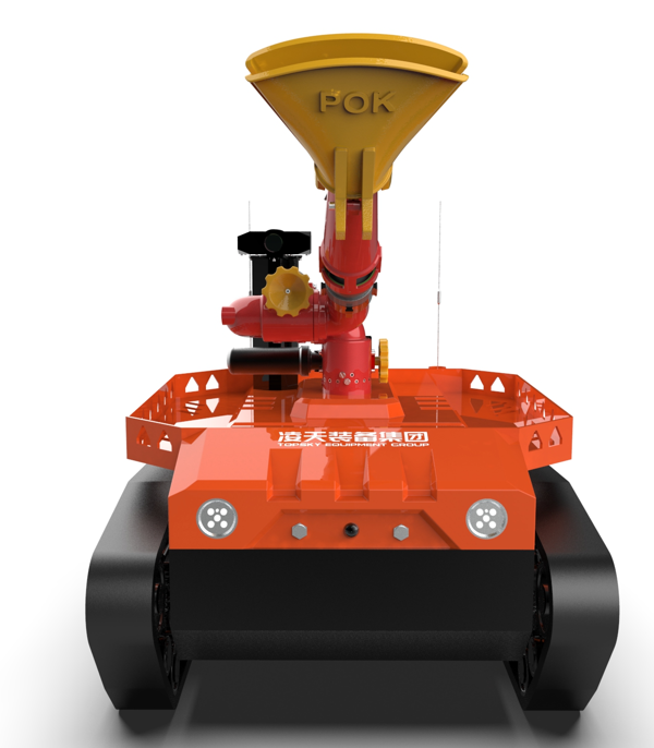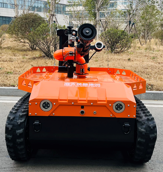 機器人采用無線遙控設計,遙控器與監(jiān)視器一體/分離,可實時的顯示電池、內(nèi)部的各種信息,機器人狀態(tài)、現(xiàn)場溫濕度、有毒有害氣體濃度報警信息等控制機器人前進、后退、轉(zhuǎn)向等運動。具備遠程偵察能力,機身搭建升降云臺、高清攝像頭、熱成像攝像頭、氣體傳感器三類環(huán)境感知設備和云臺控制設備,也可聯(lián)動聲光報警模塊提醒消防人員或群眾,有效避免危險。在通過遠程偵察手段有效獲取現(xiàn)場火源信息后,機器人配備的大功率電機可以幫助消防人員將消防水袋拖拽至危險火源區(qū)域進行滅火,并能搭載各類國內(nèi)、外的多種消防水泡,并能夠遠程控制發(fā)射水或泡沫。基于所配備的拾音模塊和揚聲器模塊,拾取現(xiàn)場環(huán)境聲音,即使消防官兵未靠近消防現(xiàn)場也能夠聽到搜救現(xiàn)場的群眾呼救聲,并通過揚聲器模塊與群眾進行現(xiàn)場對話。