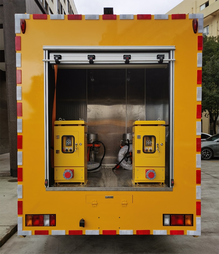 雙排座排澇車(1200m3),是在慶鈴二類汽車底盤的基礎上依據排水車的特點,配置柴油發電機組、兩臺大流量便攜式潛水泵并整合照明設備等功能設計改裝成型的專項作業車,整車尺寸較小,通過性較強,廣泛適用于各類搶險現場。