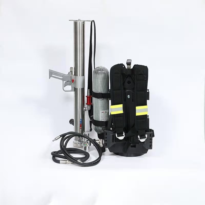 本裝置是將空氣呼吸器和細水霧滅火裝置進行有機組合,既能滿足滅火操作人員方便攜帶進入火災現場進行滅火,又能滿足呼吸需要,且重量配置合理具有背負舒適,操作簡單,維護方便等特點。