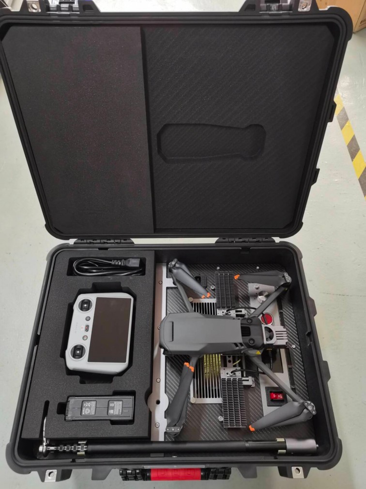 消防無人機主體為碳纖維材質,機臂可快速折疊,整機重量輕便、體積小巧,方便攜帶和快速展開。機身下方有通用載荷接口,可快速換裝不同任務載荷,通用載荷接口最大可負載5kg任務載荷,載重能力優秀。整機空載續航大于45min,超長航時可滿足大部分應用場。消防無人機配置有RTK和毫米波雷達,可實現厘米級定位精度和避障能力。